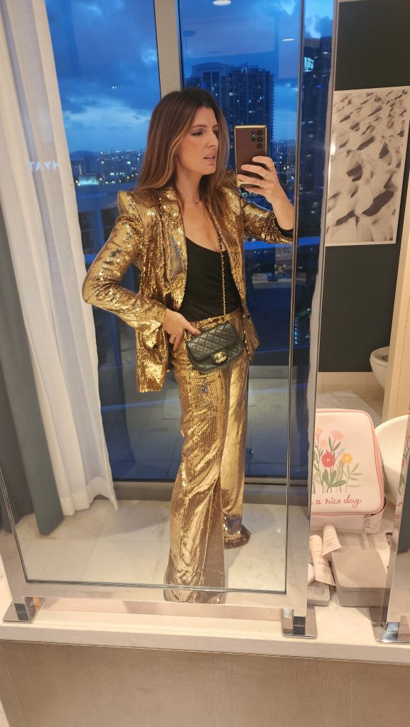 Nada grita “fiestas” como un traje o vestido dorado lleno de destellos. Opta por un diseño vintage con un giro moderno, algo que sea sleek y minimalista. Completa el look con tacones dorados o accesorios brillantes para irradiar sofisticación y captar todas las miradas.
